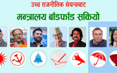 काठमाण्डौं,माघ २ । मन्त्रालय बाँडफाँटको टुंगो लगाउन सत्ता गठबन्धन दलहरूको बैठक बसेकोछ। प्रधानमन्त्री निवास बालुवाटारमा सोमबार साँझ बसेको उच्चस्तरीय राजनीतिक संयन्त्रको बैठकले मन्त्रालय भागबन्डा टुंगो लगाउने बताइएको छ। बैठकमा पाँच दलका शीर्ष नेताहरू