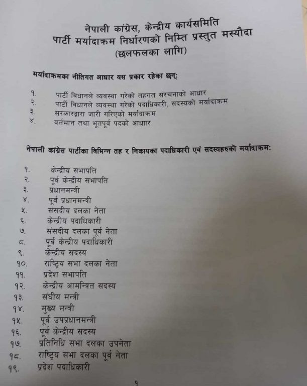 कांग्रेसको प्रस्तावित वरीयता मस्यौदा : पहिलो नम्बरमा सभापति, १२०औँ मा क्रियाशील सदस्य (सूचीसहित)