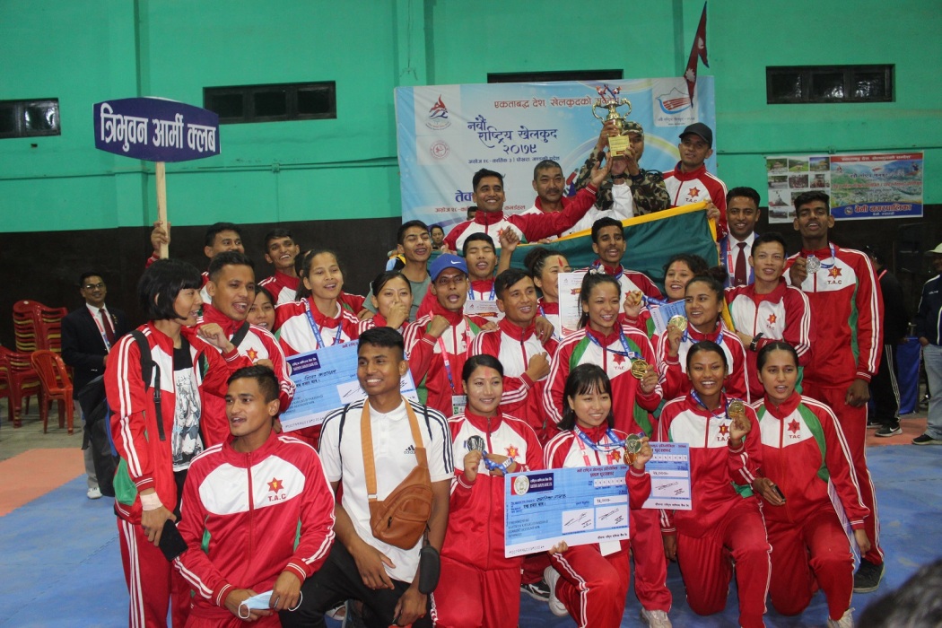 राष्ट्रिय खेलकुद परिषद्को आयोजनामा म्याग्दीको बेनीमा मंगलबार सकिएको तेक्वान्दो प्रतियोगितामा ११ स्वर्ण, ४ रजत र १ कास्य पदक जितेको प्रहरी विजेता बनेको हो । ७ स्वर्ण, ८ रजत र २ कास्य पदक जितेको नेपाली सेनाको त्रिभुवन आर्मी क्लव दृतीय तथा तीन स्वर्ण, दुई रजत र ९ कास्य पदक जितेको शसस्त्र प्रहरी तेस्रो बनेको राष्ट्रिय खेलकुद परिषद्का तेक्वान्दो प्रशिक्षक नविन श्रेष्ठले जानकारी दिनुभयो ।